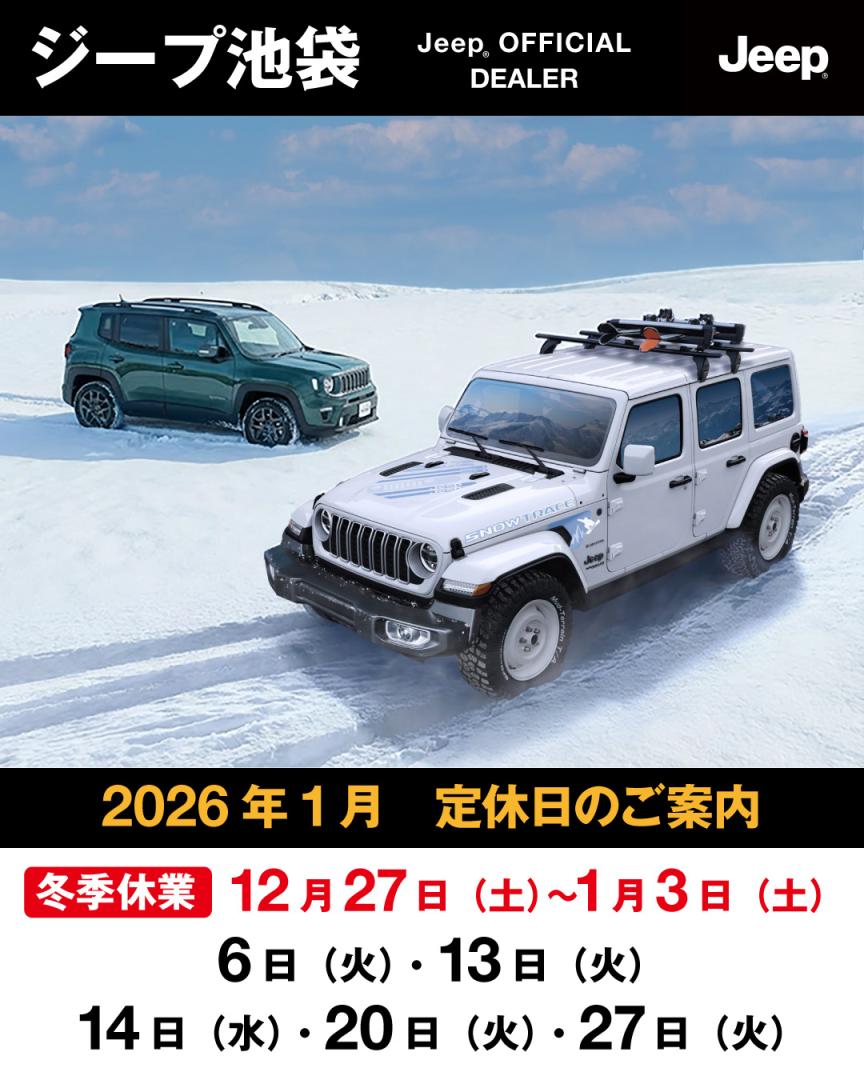 202512月26 ありがとうございました✨ みなさまこんにちは。いつもジープ池袋のブログをご覧頂きありがとうございます!あと数日で今年も終わりますね😫ジープ池袋も本日で今年の営業は終了です!みなさま今年も1年間ありがとうございました✨また来年も何卒よろしくお願いいたします🐎さて来年1月の定休日のお知らせです。みなさま良いお年を、、、💭