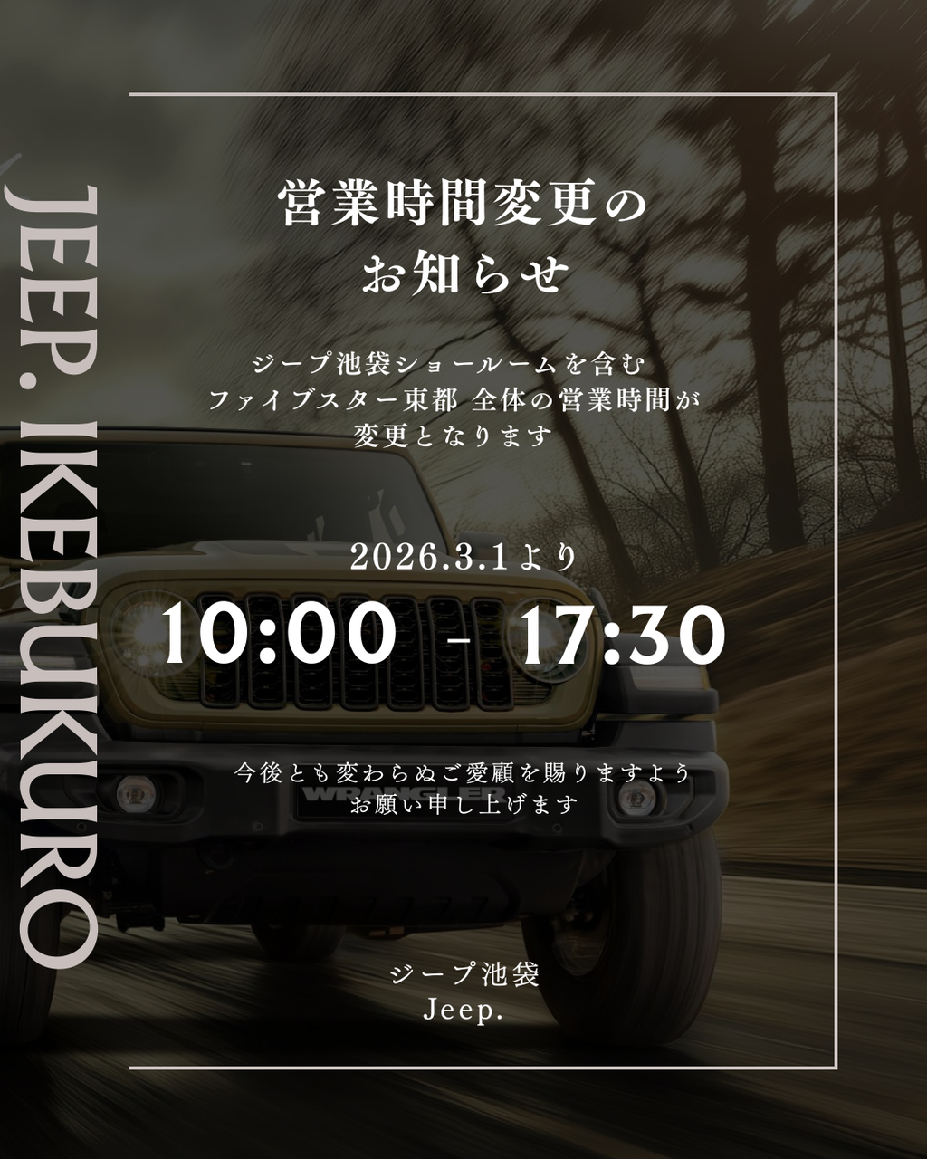 ジープ池袋を含むファイブスター東都全体の営業時間が変更となります。